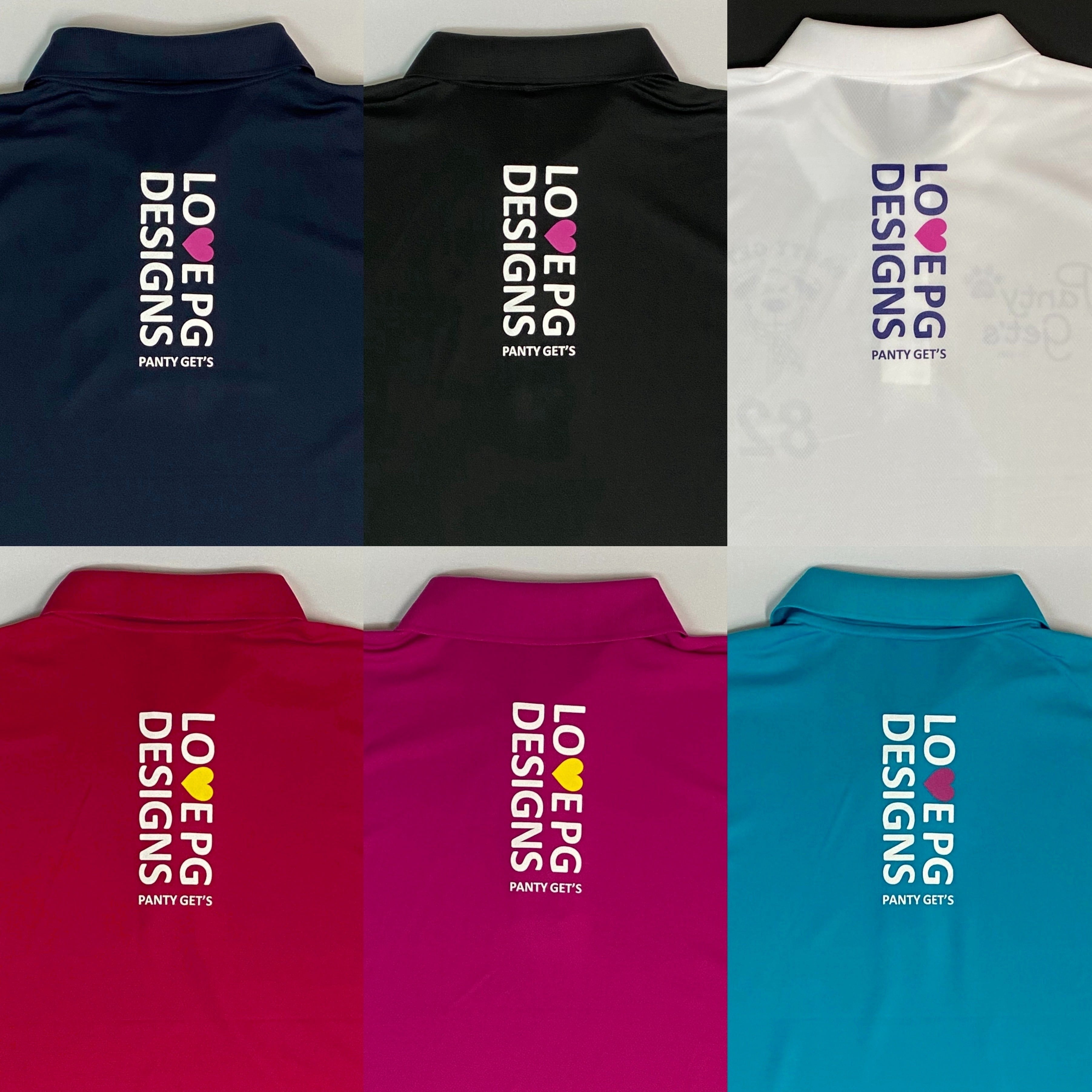 左胸にパンティーを咥えたわんこに82、右胸はPANTY GET'Sの可愛らしい文字と肉球、背面はLOVE PG DESIGNS文字を2色でプリント、右袖にはロゴワッペンを付けました。