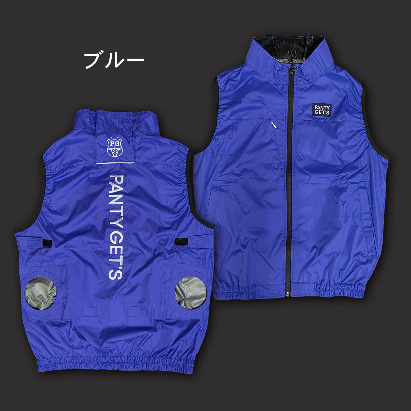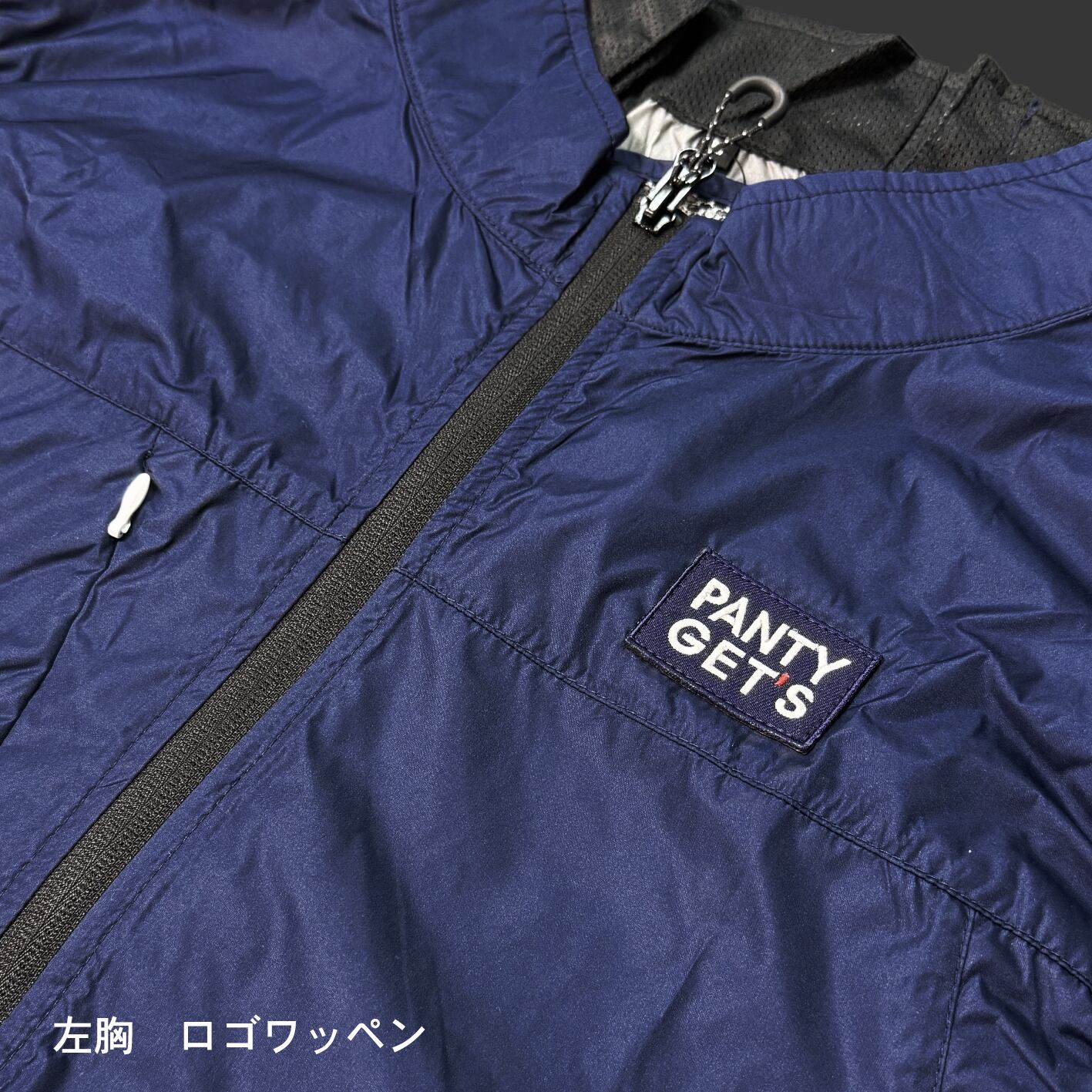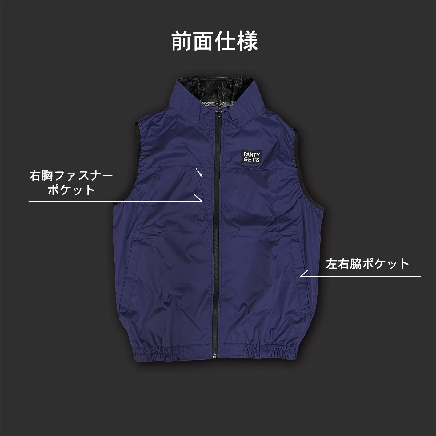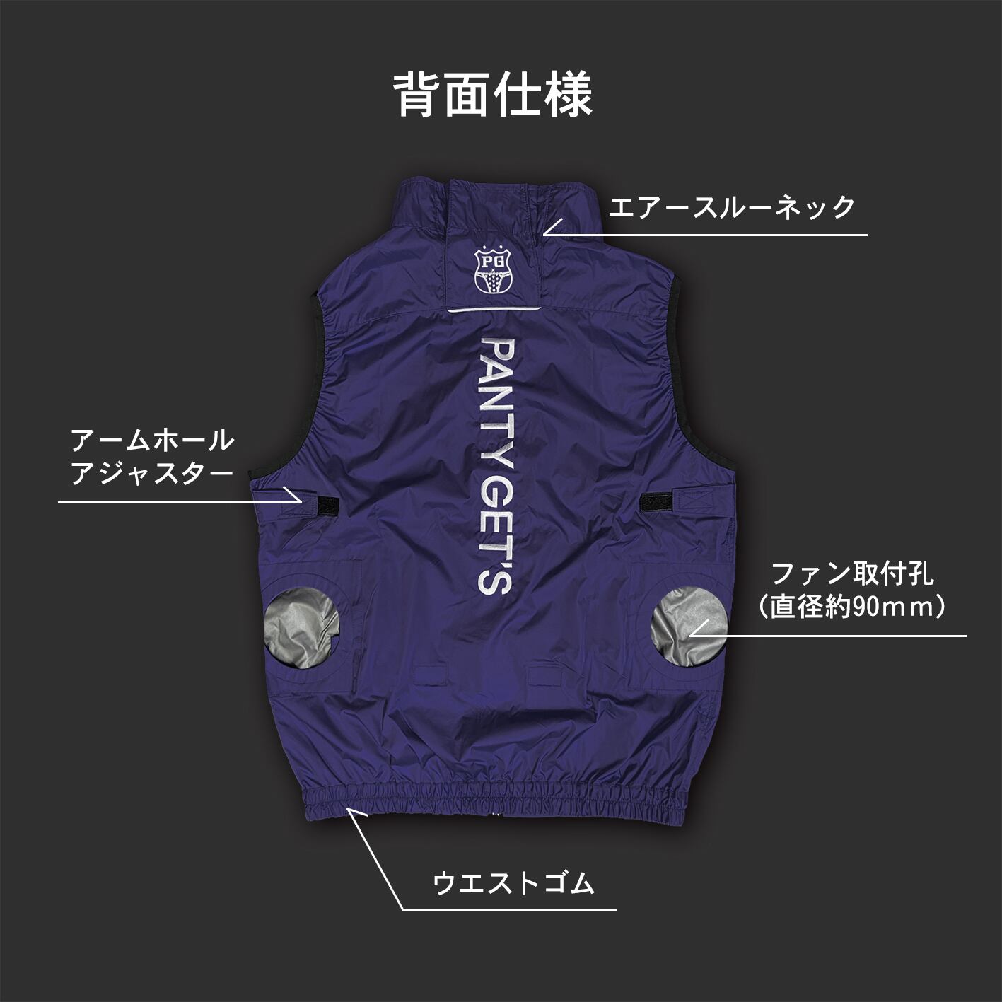 ベスト本体の左胸にPANTY GET'Sロゴワッペン、バックにパンティーエンブレムとPANTY GET'Sの刺繍を施しました。(※薄手素材のため刺繍周りは多少生地に寄りが生じます。また襟部のエンブレムと背面のPANTY GET'S刺繍は多少位置ズレが生じますので予めご了承下さい)